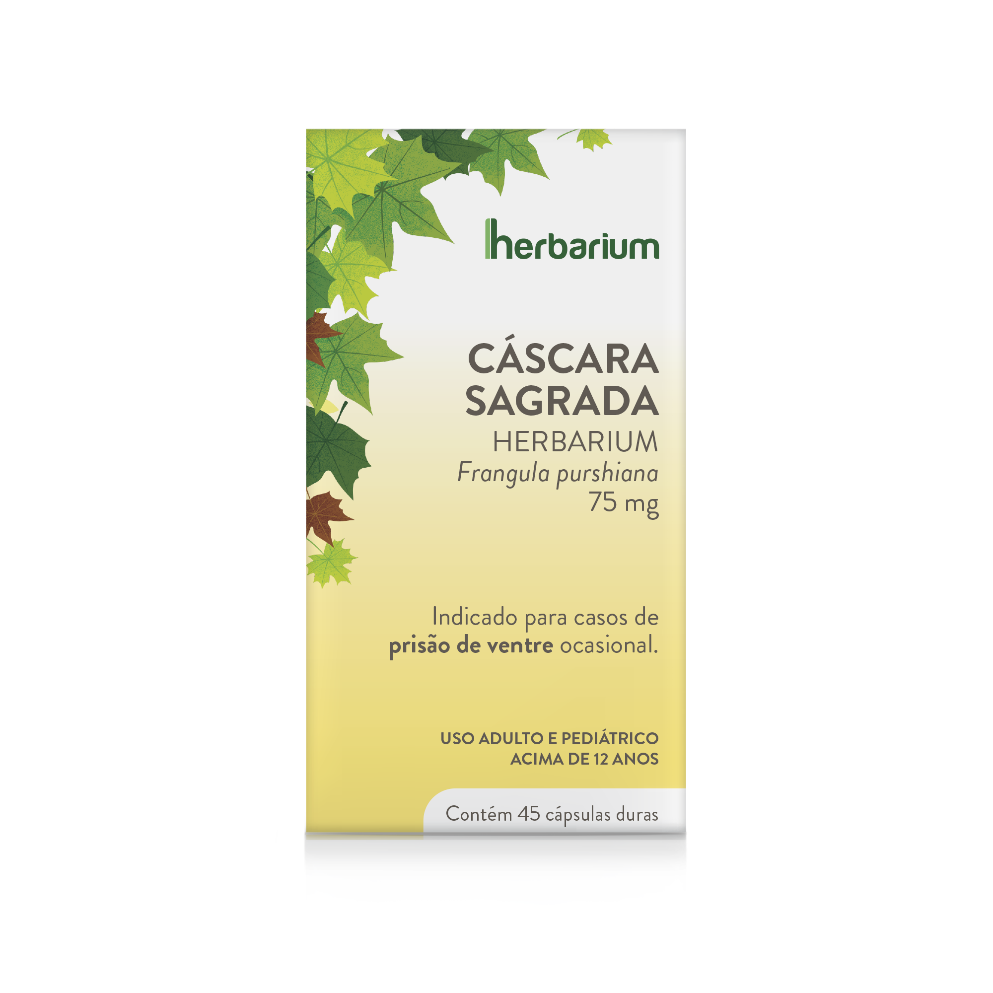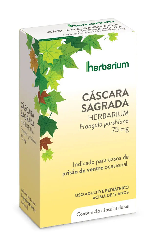 CÁSCARA SAGRADA HERBARIUM-Frangula purshiana75 mg. INDICAÇÃO: Para os casos de prisão de ventre ocasional. USO ADULTO E PEDIÁTRICO ACIMA DE 12 ANOS. CÁSCARA SAGRADA HERBARIUM É UM MEDICAMENTO. SEU USO PODE TRAZER RISCOS. PROCURE O MÉDICO E O FARMACÊUTICO. LEIA A BULA. SE PERSISTIREM OS SINTOMAS, O MÉDICO DEVERÁ SER CONSULTADO.