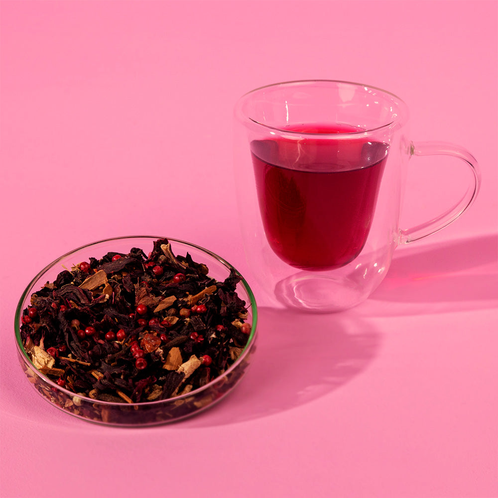 A acidez do hibisco é suavizada pelo sabor marcante das especiarias e a doçura da rosa mosqueta. É uma infusão equilibrada, levemente adocicado e picante.
