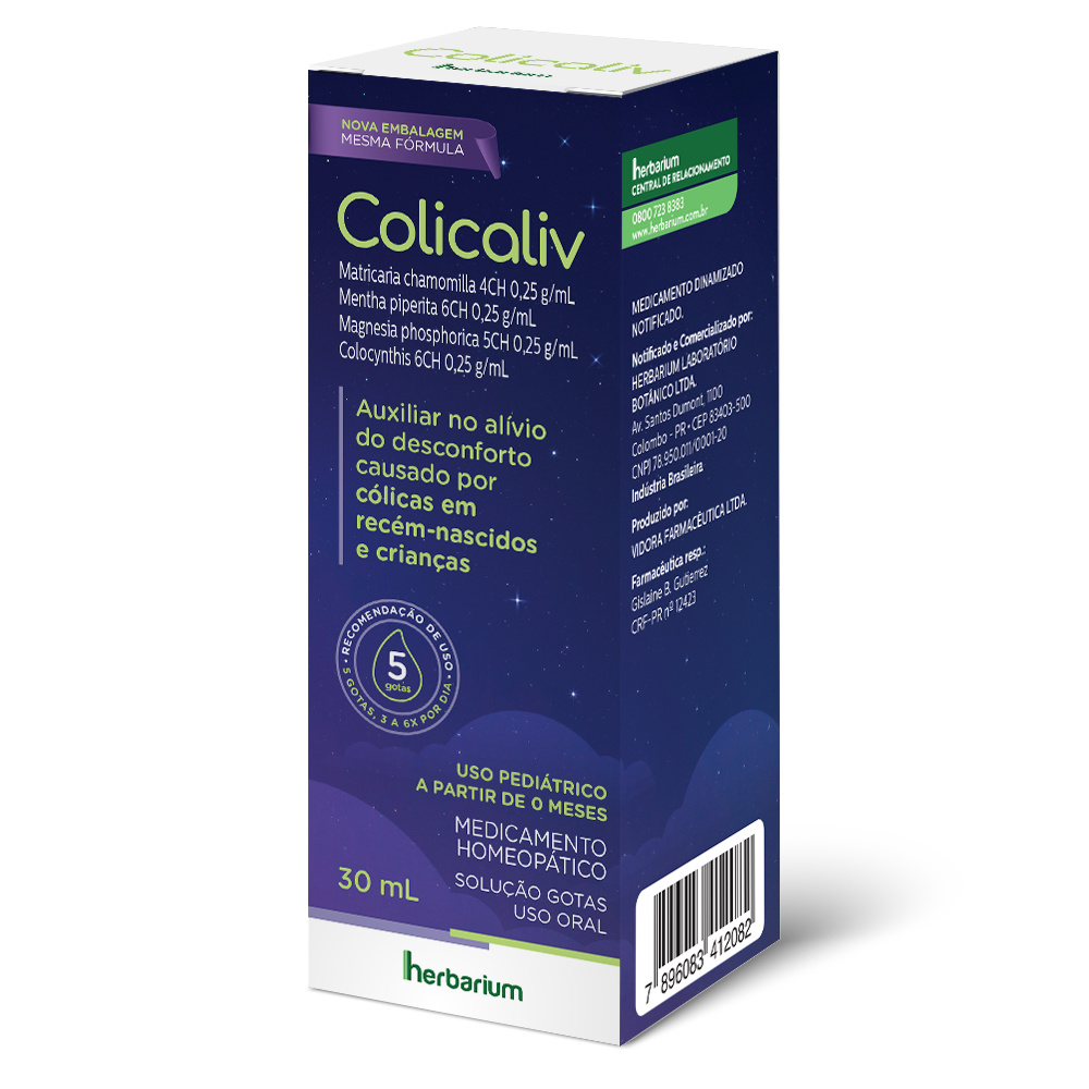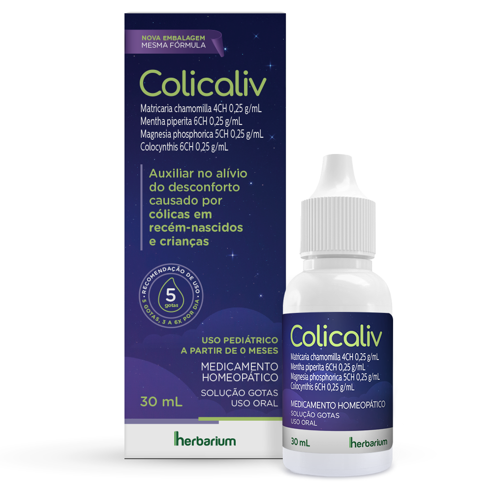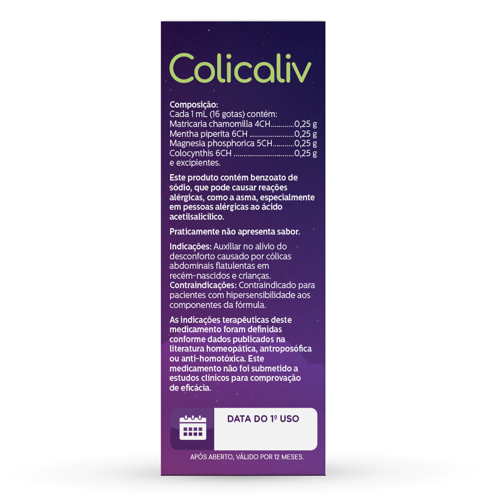 COLICALIV – Matricaria chamomilla 4CH 0,25 mL/mL, Mentha piperita 6CH 0,25 mL/mL, Magnesia phosphorica 5CH 0,25 mL/mL, Colocynthis 6CH 0,25 mL/mL.