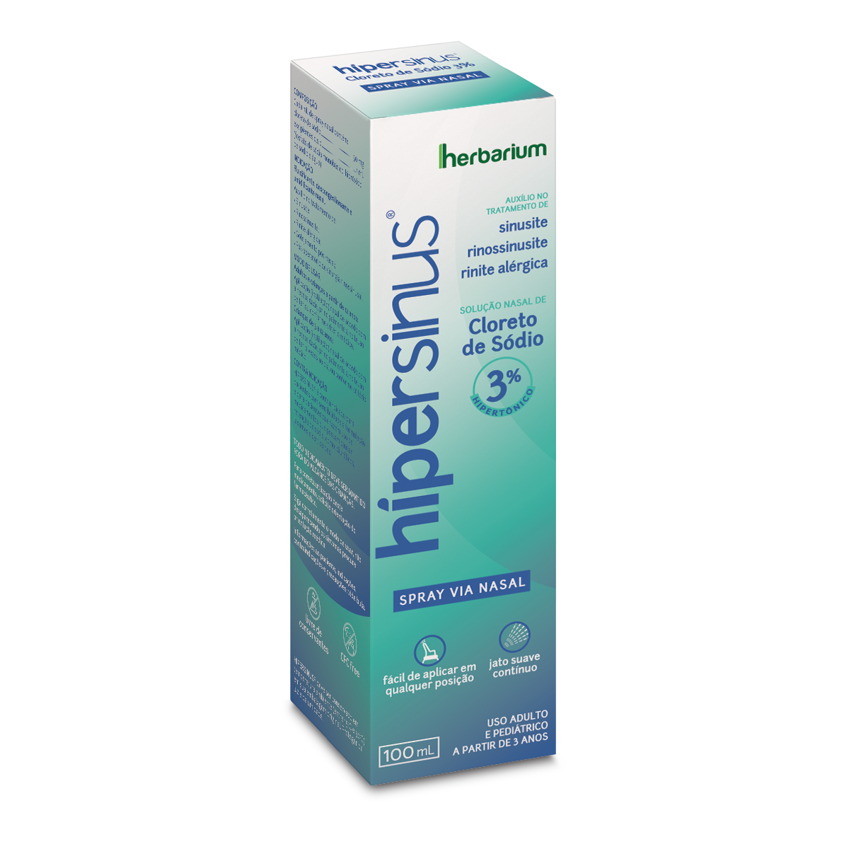 HIPERSINUS® – Solução nasal de cloreto de sódio – 3%. INDICAÇÃO: Fluidificante, descongestionante e umidificante nasal. Auxílio no tratamento de doenças respiratórias como rinite alérgica, rinossinusite, sinusite e gotejamento pós-nasal. Pode ser utilizado em pós-operatório de cirurgia rinossinusal. USO ADULTO E PEDIÁTRICO A PARTIR DE 3 ANOS DE IDADE. MEDICAMENTO NOTIFICADO conforme RDC nº 576/2021.