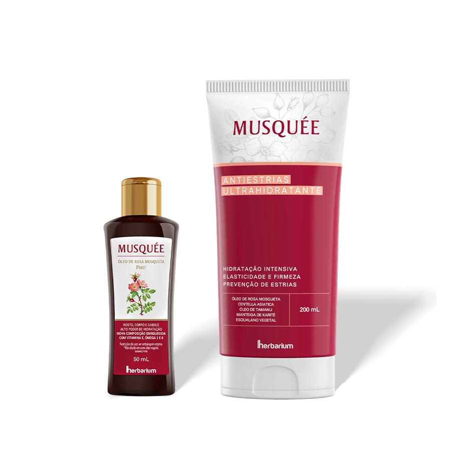 Cuidado e nutrição em todas as fases da maternidade. Restaura a firmeza, melhora a elasticidade e mantém a pele intensamente hidratada, macia e radiante. ÓLEO DE ROSA MOSQUETA PURO*Musquée Óleo de Rosa Mosqueta Puro* é extraído diretamente das sementes da rosa rubiginosa e não diluído em outro vegetal. Altamente concentrado em vitaminas, antioxidantes e ácidos graxos essenciais, ele hidrata intensamente a pele, o rosto e os cabelos.Sua fórmula natural estimula a produção de colágeno, contribuindo para a melhora da firmeza, elasticidade e uniformidade da pele. Com textura leve e toque suave, o Musquée Óleo de Rosa Mosqueta Puro* suaviza marcas, clareia manchas e auxilia na redução de cicatrizes, favorecendo a regeneração da pele em todas as fases da vida. Sua ação restaura o viço, devolve o brilho natural e proporciona a maciez que a sua pele merece.CREME ANTIESTRIAISMusquée Creme Antiestrias Ultrahidrantante com Óleo de Rosa Mosqueta, Centella Asiática, Óleo Tamanu, Manteiga de Karité e Esqualano Vegetal proporciona hidratação prolongada, ajudando a prevenir novas estrias e a suavizar visivelmente as já existentes.Seus ingredientes exclusivos e com eficácia comprovada, melhoram a elasticidade e a firmeza da pele, enquanto combatem o ressecamento e proporcionam um toque suave, macio e iluminado. Enriquecido com um potente complexo nutri-hidratante, o creme promove uma pele visivelmente mais firme em apenas 21 dias. Desenvolvido especialmente para atender às necessidades da pele durante a gravidez e o pós-parto, alivia a sensação de repuxamento e o desconforto em quase 95% das mulheres.R$ 172,00R$ 137,00