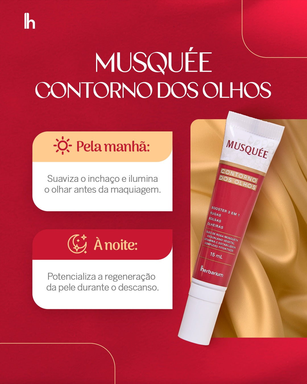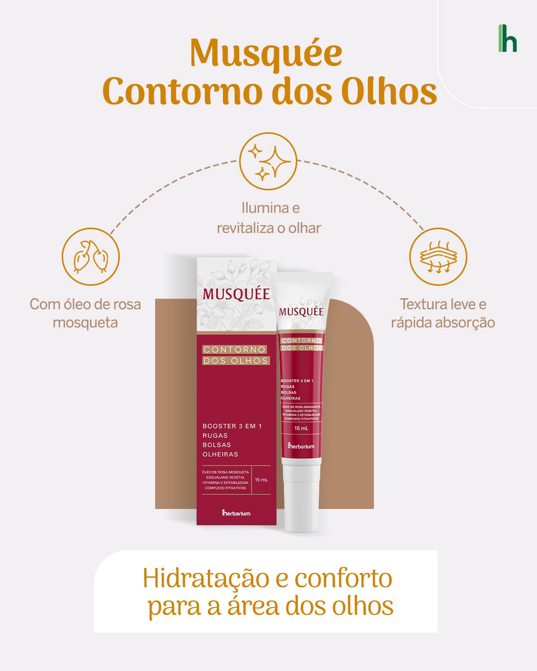 Booster 3 em 1 iluminador para o contorno dos olhos, com fórmula inovadora e rica em ativos naturais. Combina óleo de rosa mosqueta, esqualano vegetal, vitamina C e um complexo de fitoativos para prevenir rugas, reduzir bolsas e olheiras, e iluminar a região dos olhos, tudo com suavidade e eficácia.