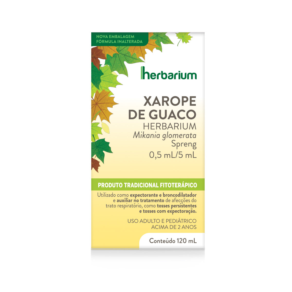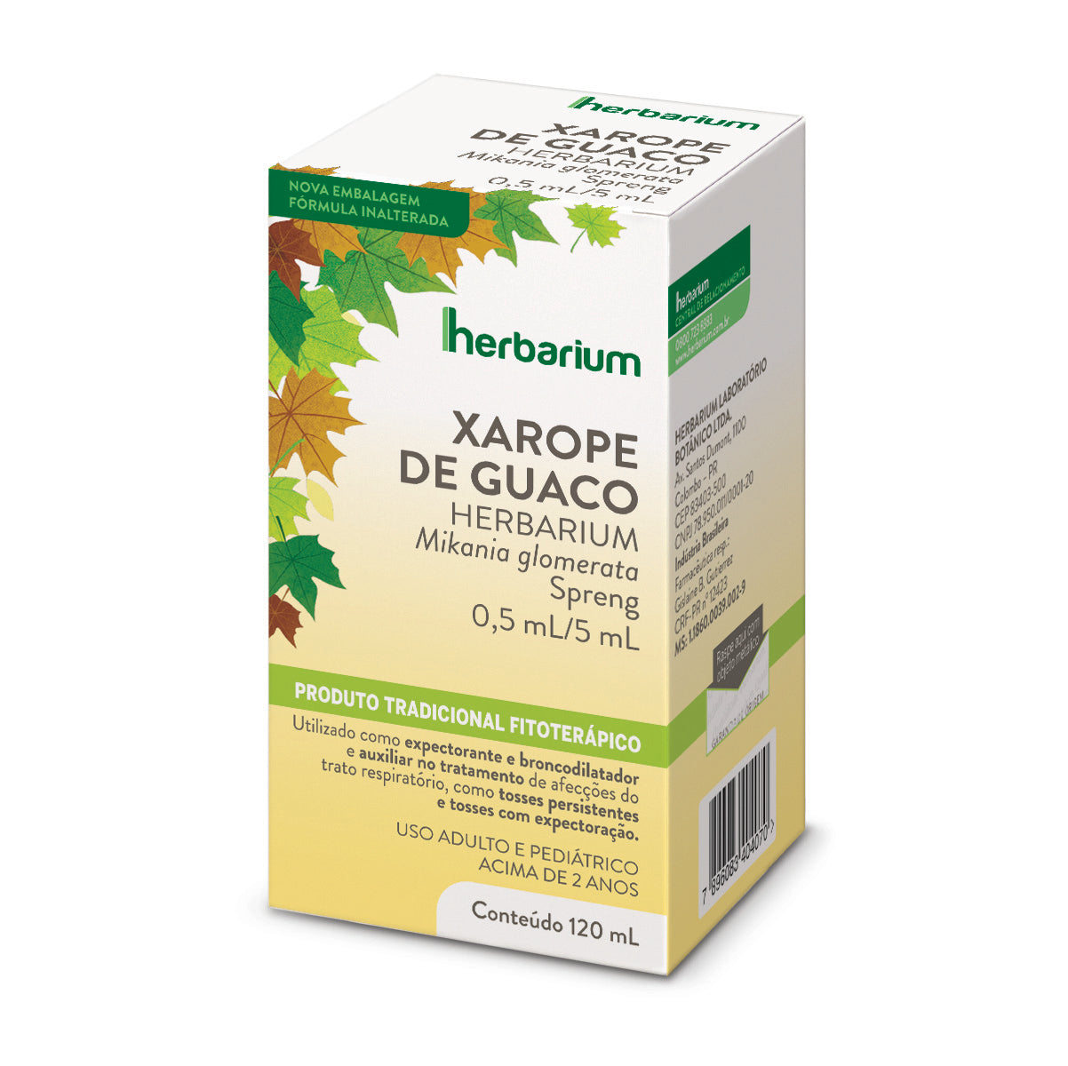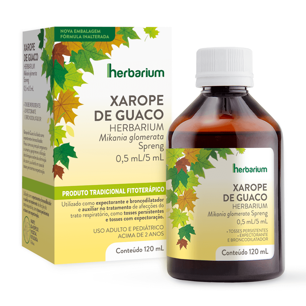XAROPE DE GUACO HERBARIUM-Mikania glomerata0,5 ml/ml. INDICAÇÕES: Auxiliar no tratamento de afecções do trato respiratório, como tosses persistentes e tosses com expectoração. USO ADULTO E PEDIÁTRICO ACIMA DE 2 ANOS. MS: 1.1860.0039 . *Primeiro xarope de guaco simples registrado na ANVISA.